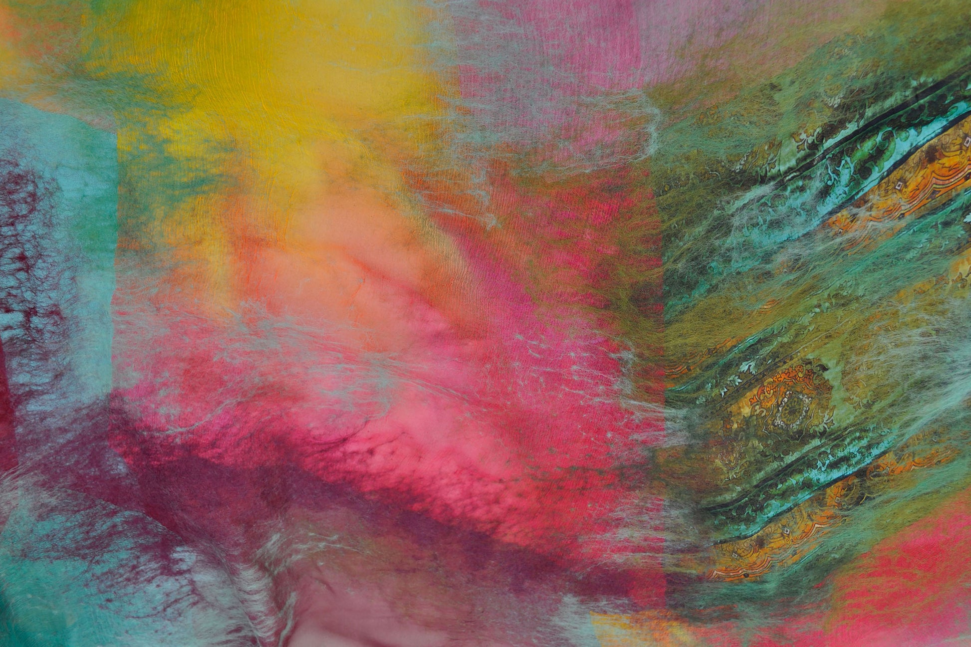 I started making the shawl with these thoughts in mind, letting myself travel through the irrational world. Everything is intertwined in it - dreams, fantasies, fragments of memories and impressions, in a word, everything from which the imagination weaves a carpet of creativity. It was basically a meditation in which I was catching signals from space and giving them earthly forms in color, although I have no idea what I was doing. It is at such times that you understand very well that creativity isn't the realization of your "I" at all, but rather a gift given from above, and you are just a tool, a means of creating a form.