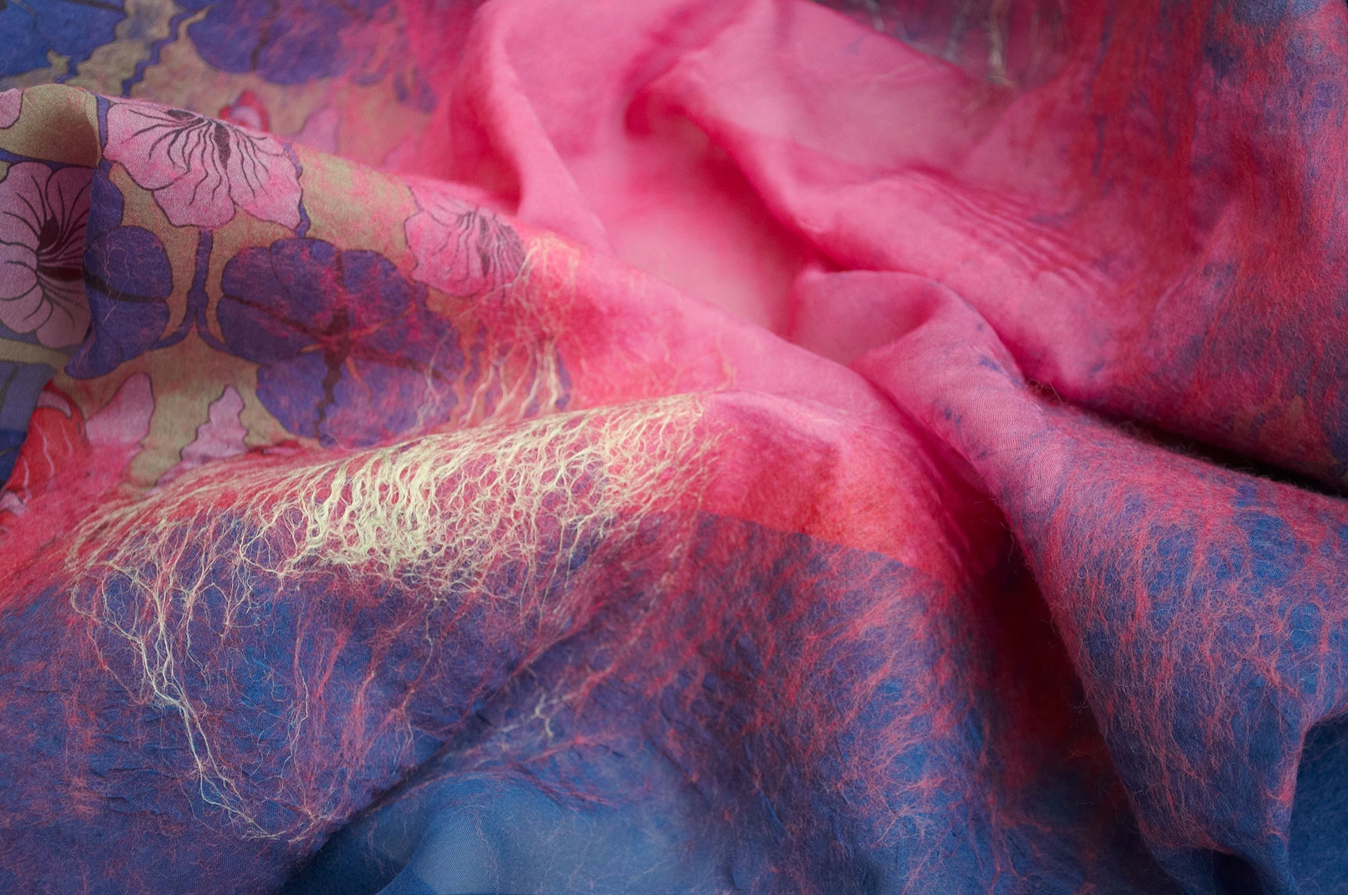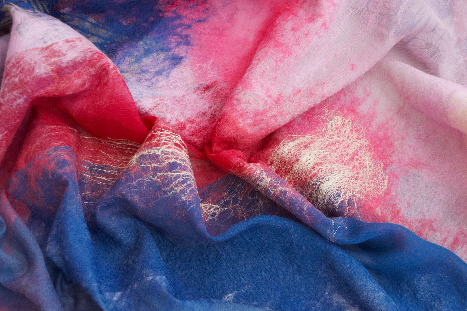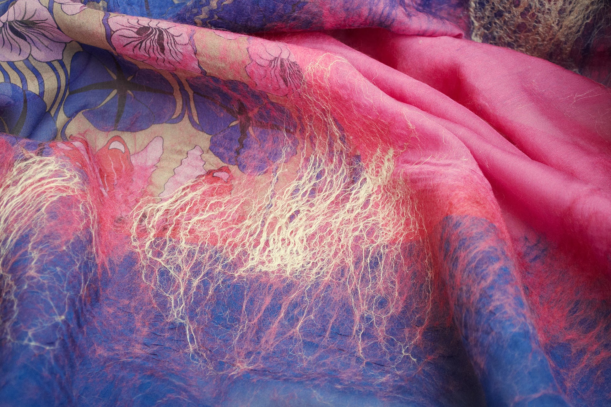 The shawl is made from the finest natural Italian silk and delicate merino wool 16 micron. Decorated with golden fibers of wild Muga silk.