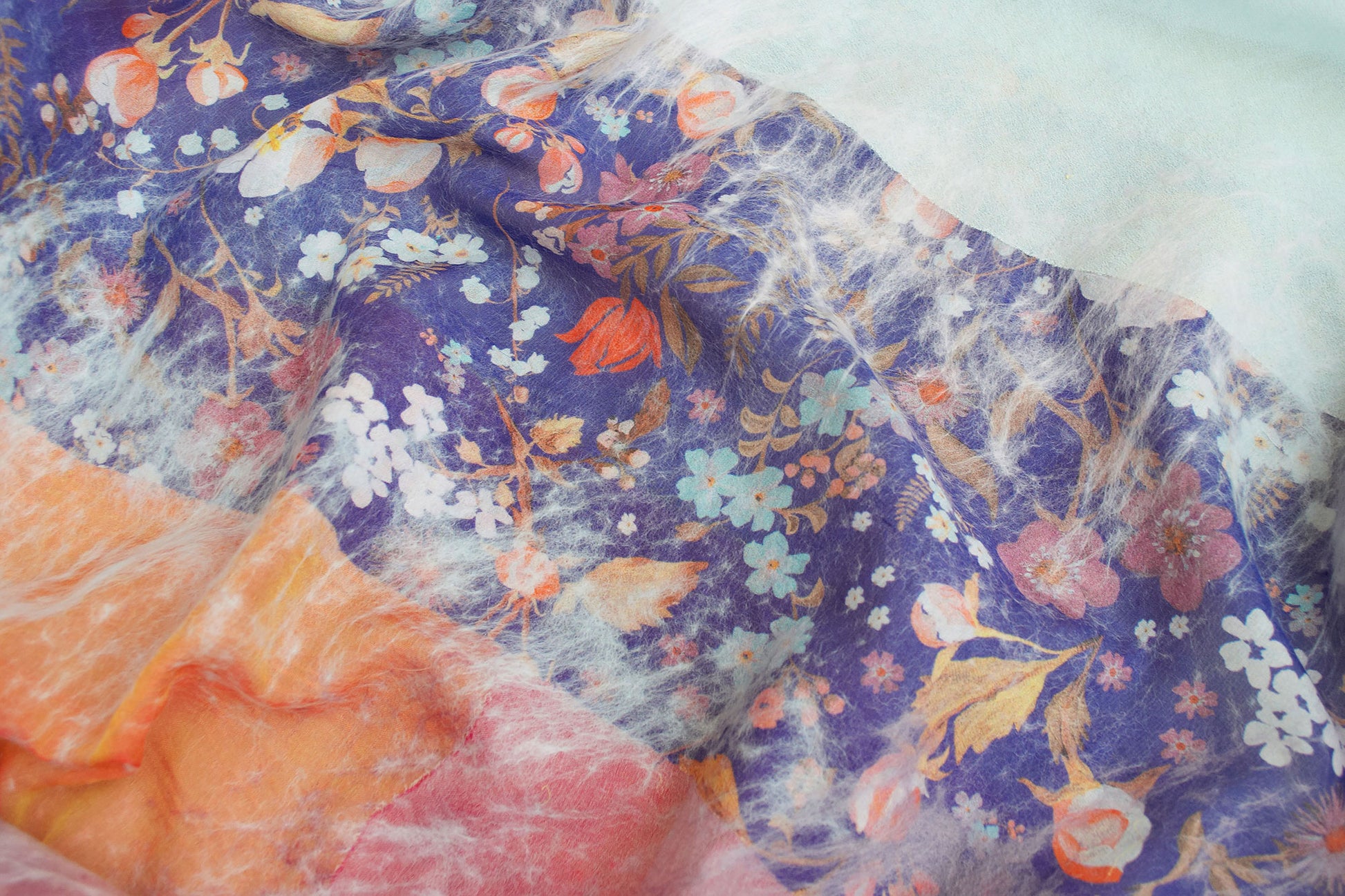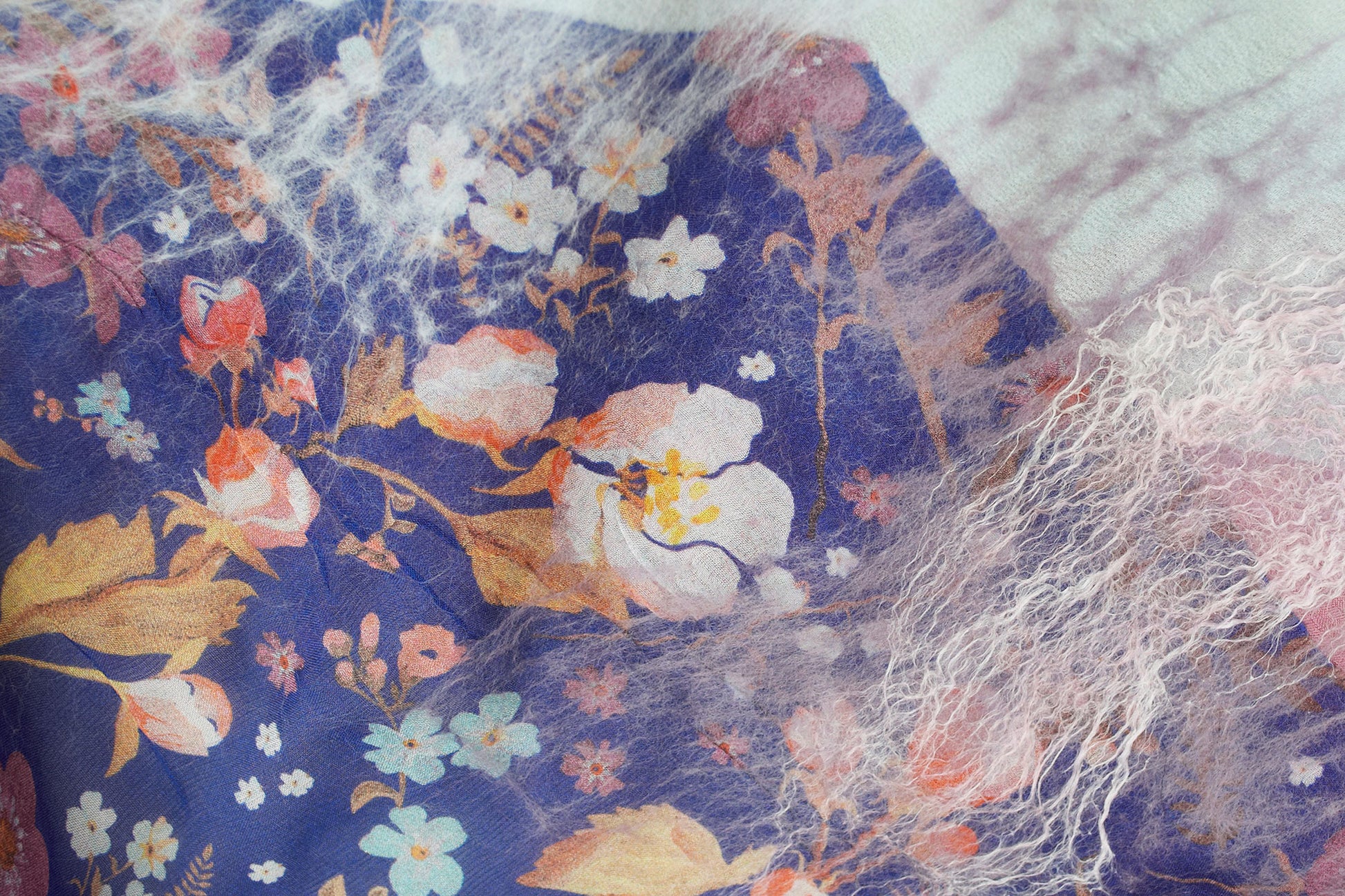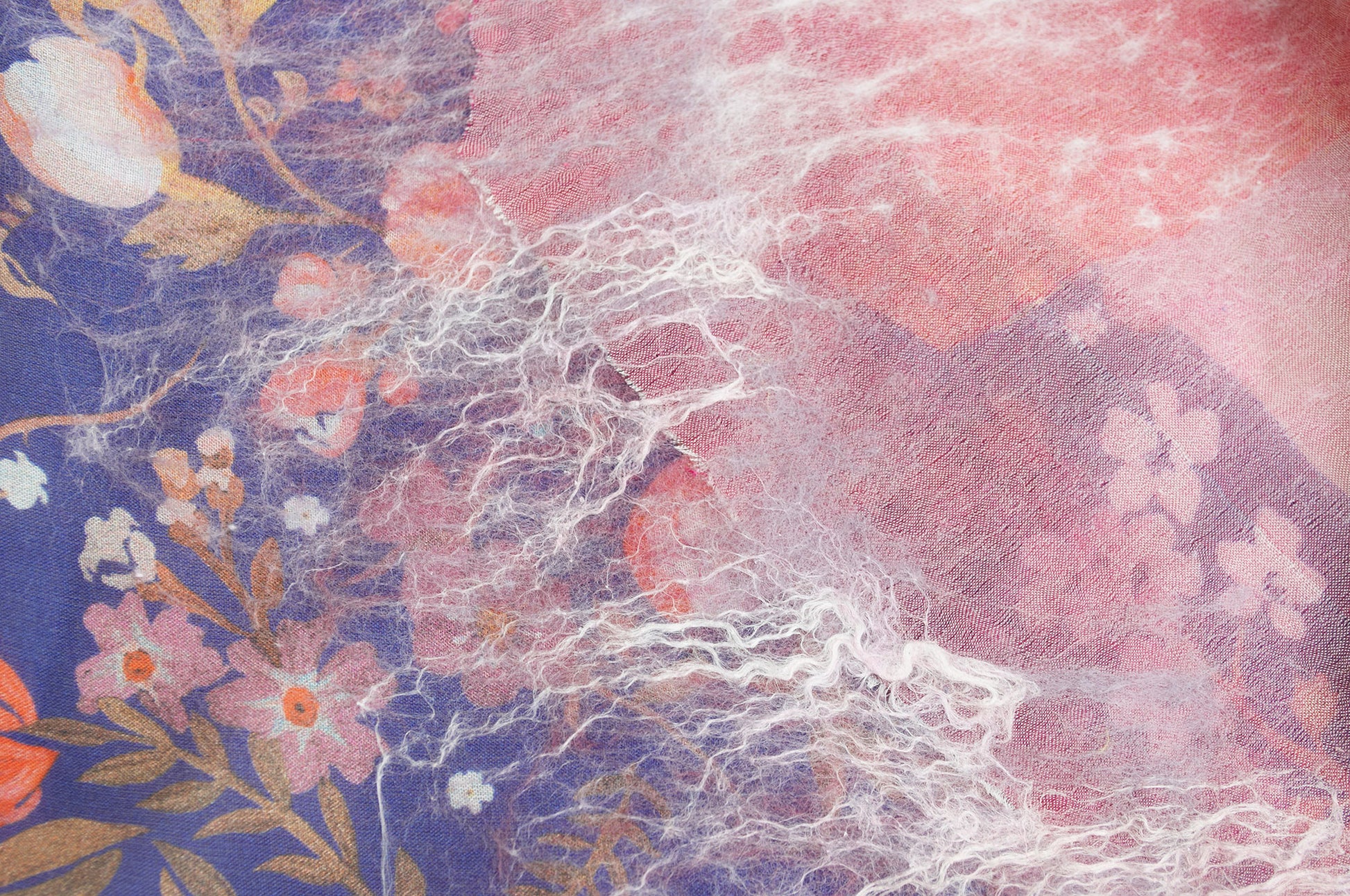 The shawl is made from British Liberty silk with the addition of finest natural Italian silk and delicate merino wool. Decorated with hand-dyed Mulberry silk fibers.