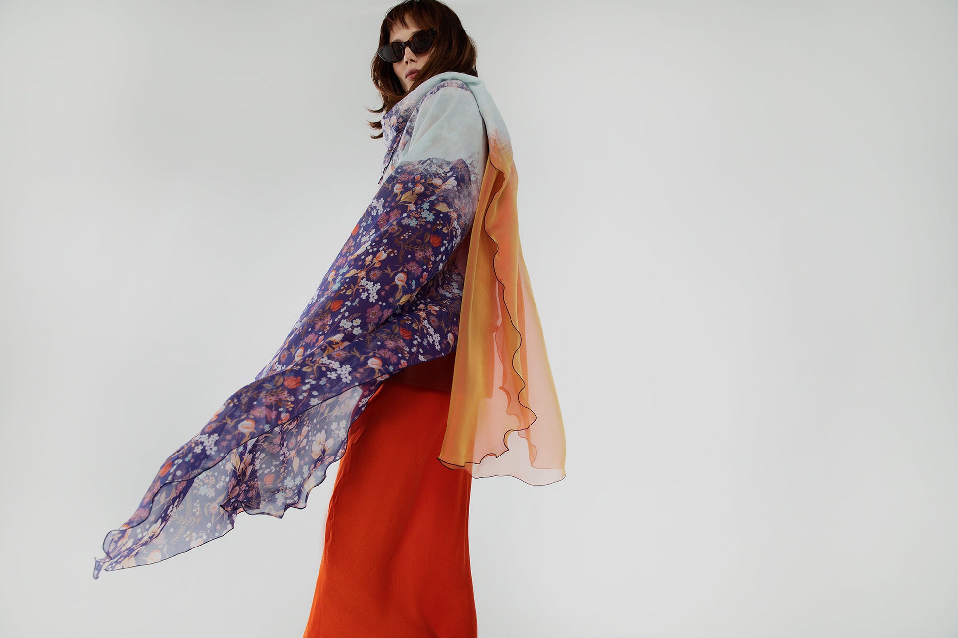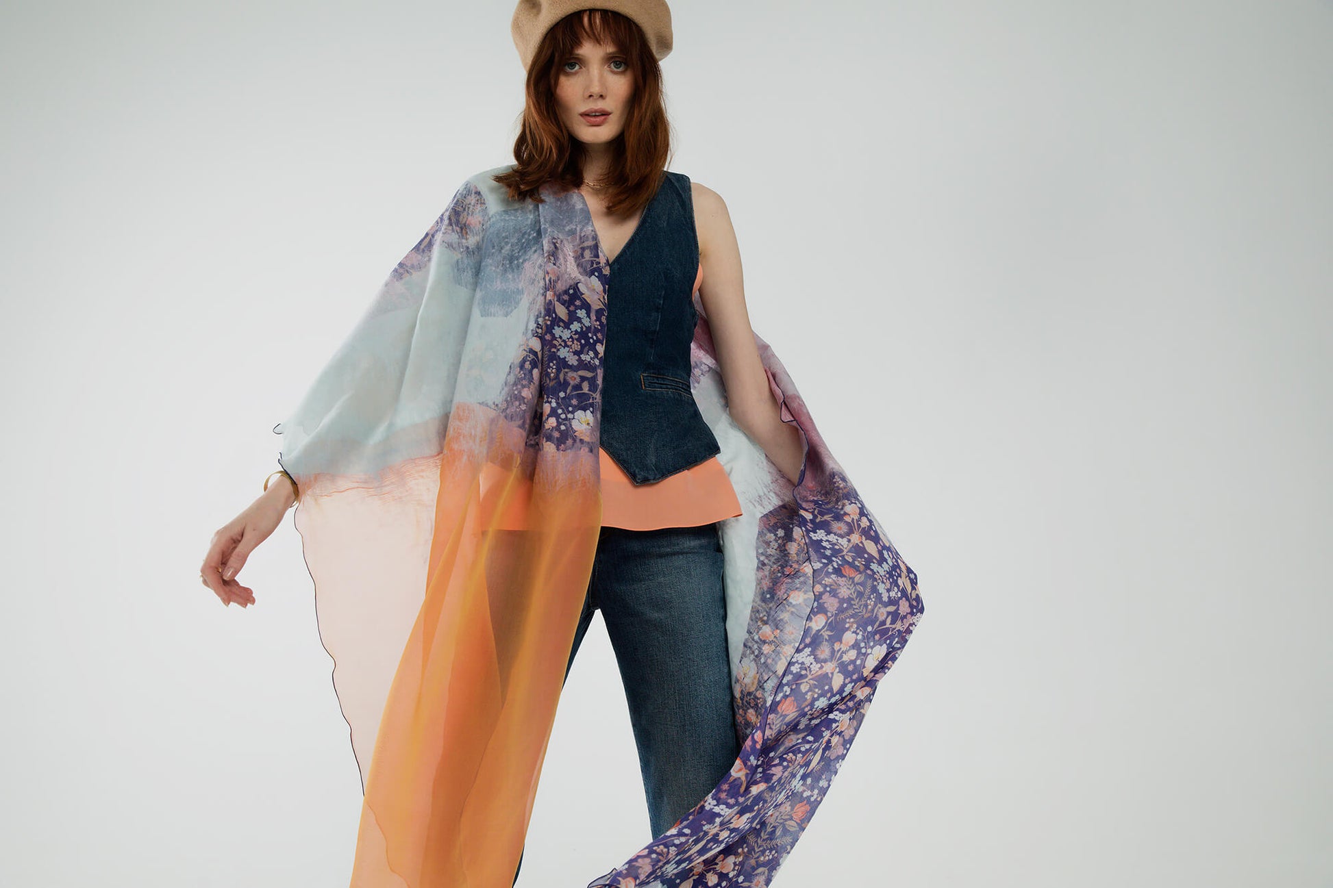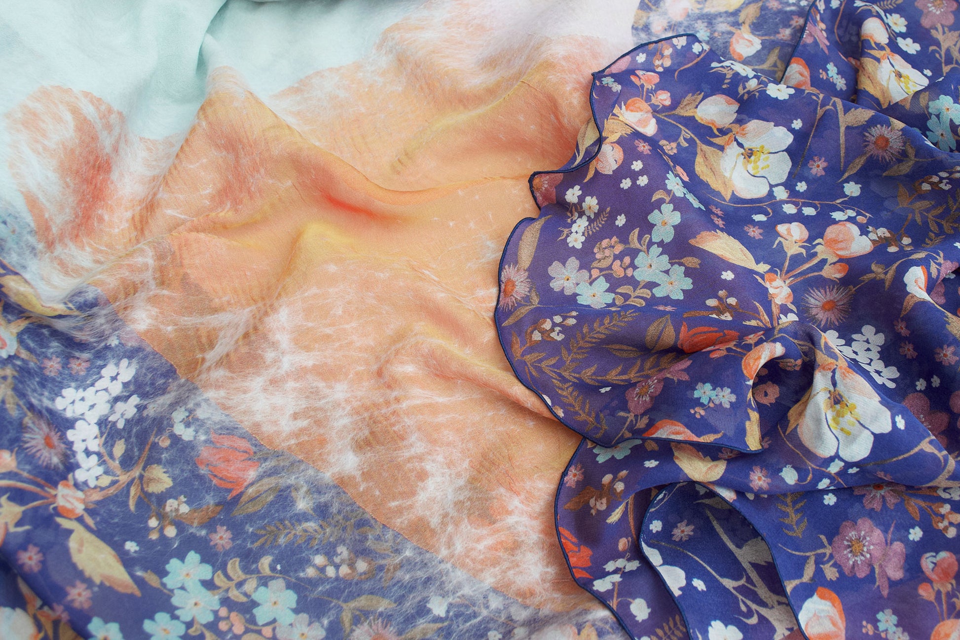 The shawl is made from British Liberty silk with the addition of finest natural Italian silk and delicate merino wool. Decorated with hand-dyed Mulberry silk fibers.